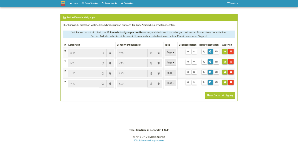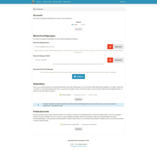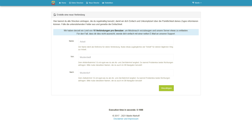 Which lead me to the creation of the "Pendler Info" project. It's a small web application, which allows you to enter your start & end destination, that you are usually traveling. "pendeln" is German and is used if you are constantly traveling to & from a given location e.g. to work. It will then track if your connection might get canceled or is delayed and will inform you via your desired channel of choice. For me, it was giving me a heads-up via Alexa in the morning before I go to the station and short to the point telegram messages while I'm in the office. Before I have to leave.