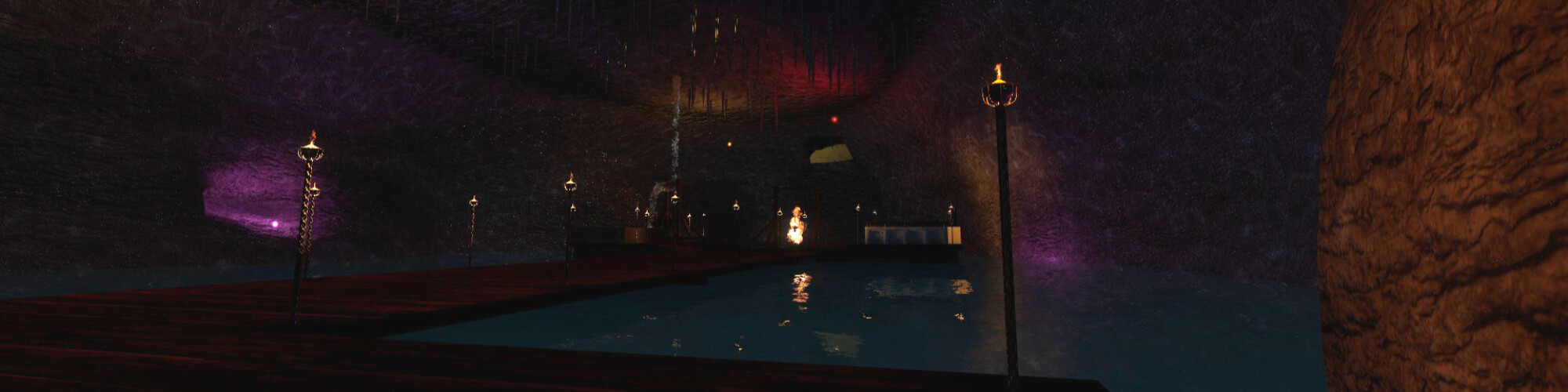 The map is set within a halfway flooded underground cave, which is adorned with crystals on the ceiling, colorful fireflies, and caustics coming from the moonlight which breaks through a small hole in the ceiling of the cave.